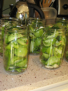 Yesterday I went to the store and bought a canning water bath along with the ingredients to make pickled green tomatoes. Here is the recipe that I tried: http://www.andreasrecipes.com/2008/10/27/pickled-green-tomatoes/. It was really fun making the pickles. I hope they turn out good!